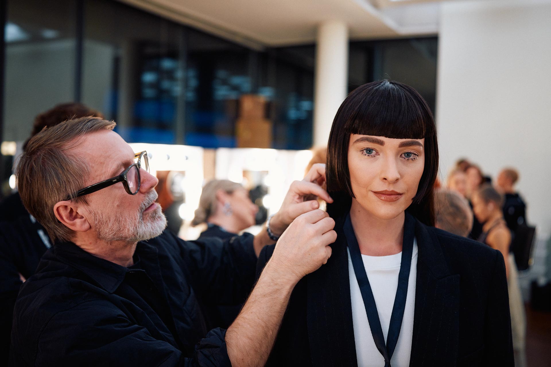 Gemeinsam mit 40 Stylisten und Visagisten kreierten Alexander Dinter und Steffen Zoll die eindrucksvollen Beautylooks der über 50 Models. Alexander Dinter sorgte mit einem Geniestreich für ein faszinierend uniformes Hairstyling, das im spannenden Kontrast zu der facettenreichen Mode von MARC CAIN stand: Alle Models trugen hochwertige, schwarze Langhaar-Perücken, die mit einem markanten ‚edgy‘ Grafik-Cut und auffälligen Pony bestachen. »Nach einer längeren Zeit, in der wir die unterschiedlichsten Haarlooks in einer Runway Show gesehen haben, ist es eine schöne Abwechslung, einen konsequenten und starken Einheitslook zu kreieren«, so Alexander Dinter zu seiner Inspiration. »Einen solch exzentrischen Haarschnitt für die Kollektionspremiere zu zeigen, ist ein echtes Statement für MARC CAIN. Letztendlich ist es bei mehr als 50 Modellen die einzige Möglichkeit, wirklich einen identischen Look bei jedem Mädchen zu zeigen.«